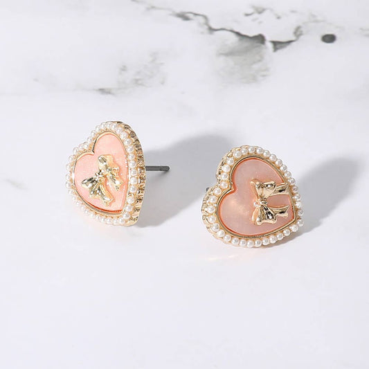 Pearl Paved Bow Enamel Heart Stud Earrings