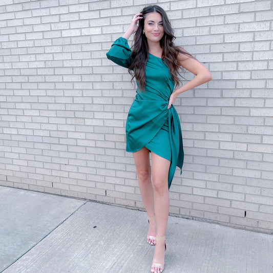 Eden Paris Green One Shoulder Puff Sleeve Dress