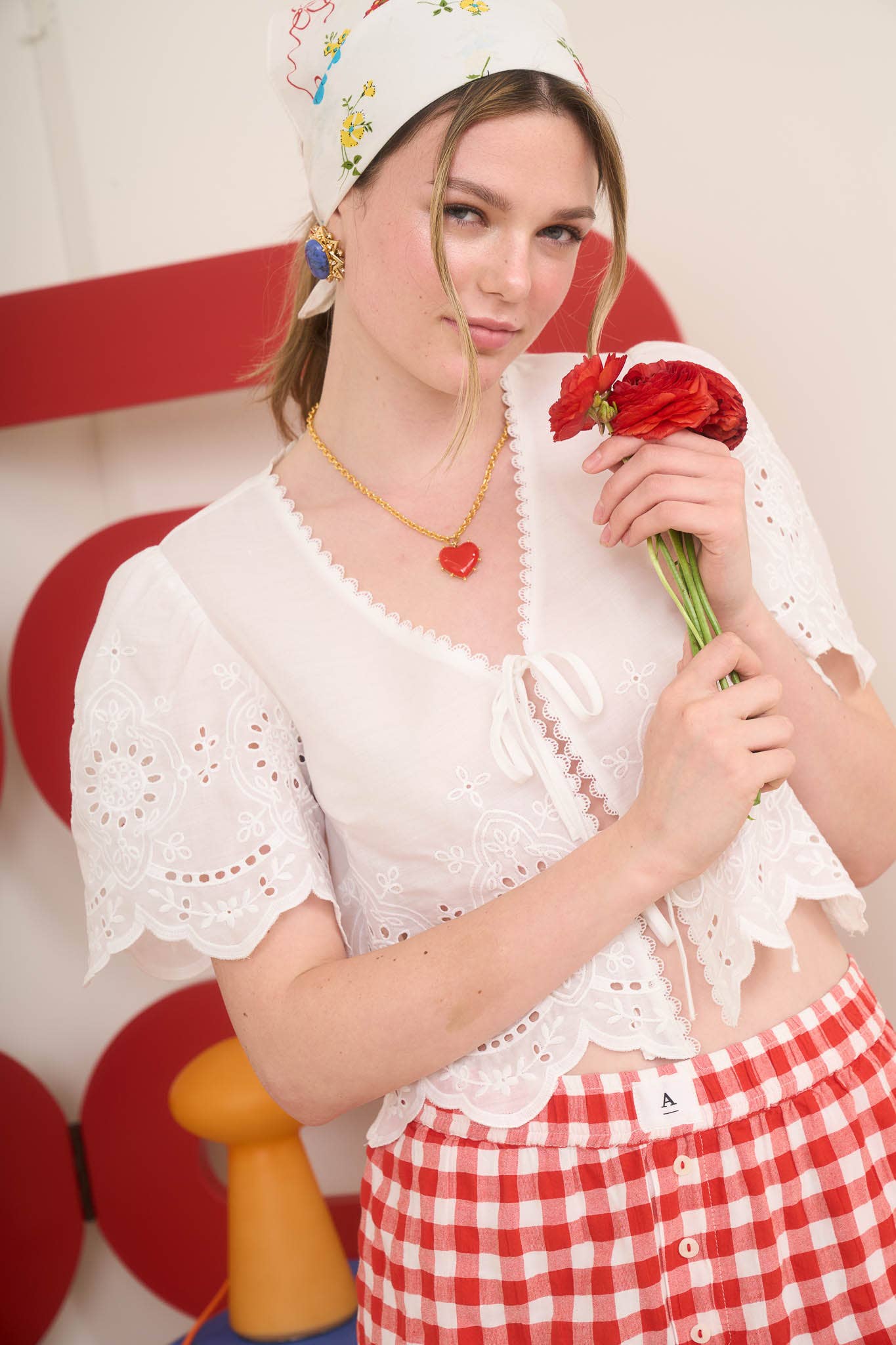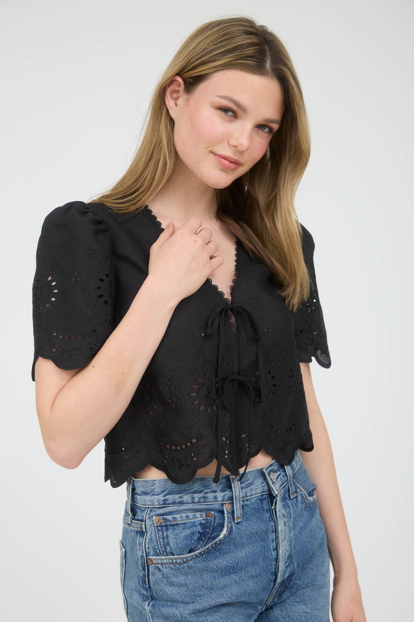 "Add a touch of whimsy to your wardrobe with our Amy EMBROIDERED EYELET SCALLOP TRIM FRONT TIE CROP TOP! The delicate embroidery and scalloped trim create a playful look, while the front tie adds a unique twist. Perfect for a sunny day out (or a fun-filled festival)! "