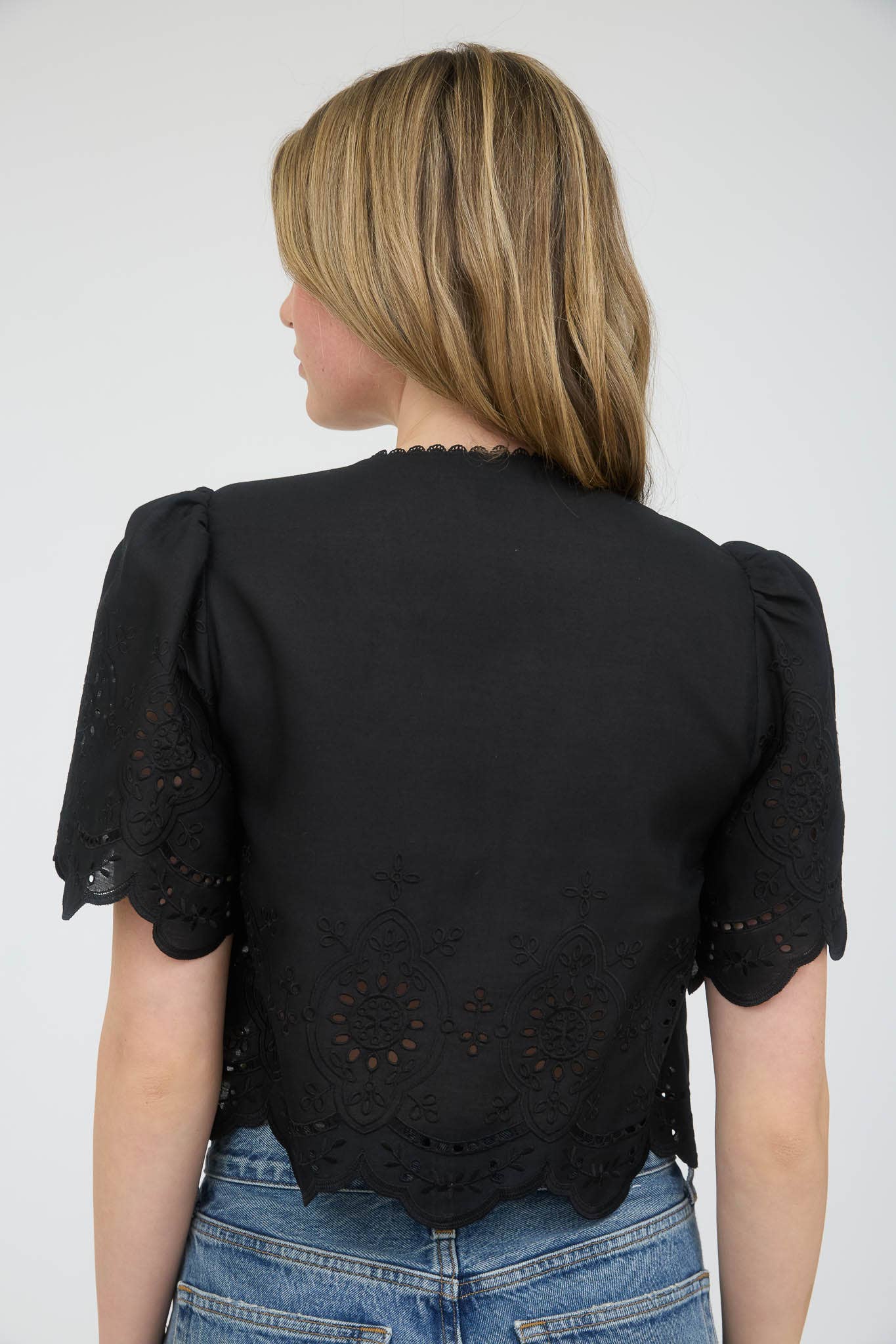 TB8863 2 SMALL 2 MEDIUM 2 LARGE V NECKLINE SHORT SLEEVE SCALLOP LACE TRIM SCALLOP HEM DETAIL EMBROIDERED EYELET DETAIL SOLID NOT LINED CROPPED WOVEN TOP SELF: 95% POLYESTER, 5% COTTON CONTRAST : 100% POLYESTER EXCLUSIVE OF DECORATION